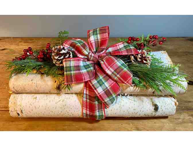 This bundle contains about 3 white birch logs cut 18 inches long, tied together with a seasonal bow and decorated with fresh pine and cedar, berries and pinecones. Place hearthside or on your front porch for that perfect festive touch!