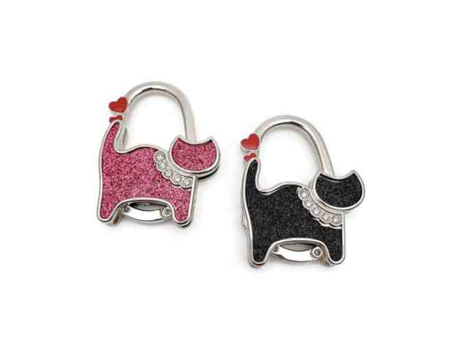 Includes one black and silvertone cat purse hook and one pink and silvertone cat purse hook. Keep one and share with a friend.