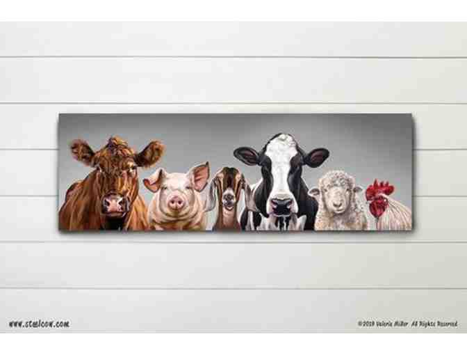 From Steel Cow: An icon of Steel Cow "The Girls and Friends"ÂÂ is an original Steel Cow image that makes anyone feel like they're home on the farm. Featuring 6 of our most popular images in one awesome canvas print this special edition gray background version is available for a limited time while supplies last. Arrives with fully printed gallery wrapped edges, no need for a frame, with a built in hanger ready to hand straight from the box. This canvas print is 8 x 24" in size.