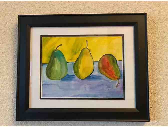 You are bidding on a watercolor "pears" painting with a black frame and white/black mats.