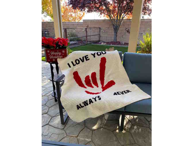 You are bidding on a crocheted throw blanket - "I Love You, Always 4Ever" with big ILY sign in red color. Throw in ivory color. Measurement: 43" wide and 49" long