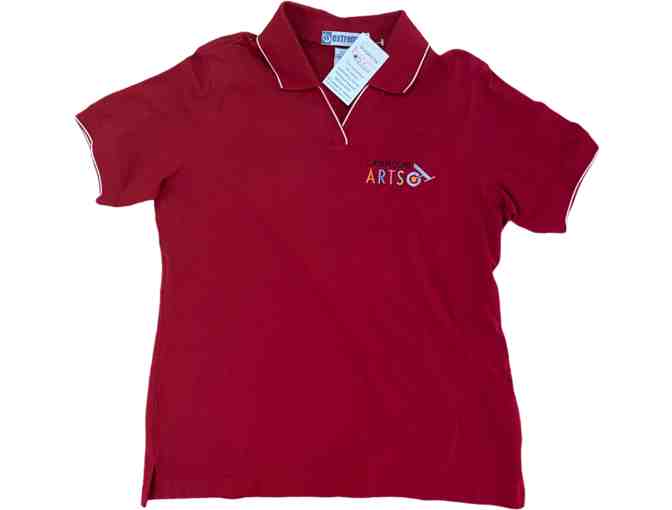 Red polo shirt with custom embroidered Catamount Arts Logo