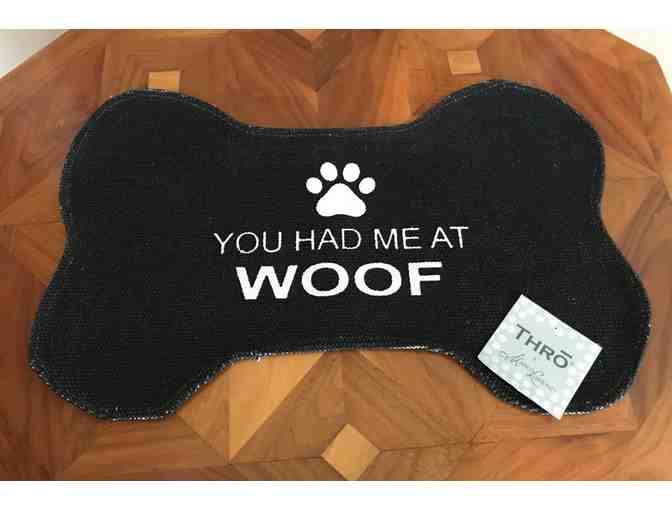 Black mat featuring "YOU HAD ME AT WOOF" sentiment Organize, beautify and protect! Keep your little messy eater's dining area and your floors clean with this attractive pet placemat.
