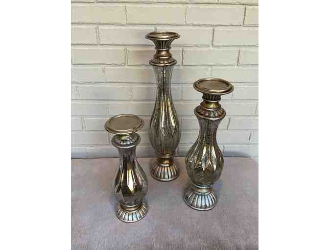 Set of 3 Mercury Glass Candle Holders. Small measures 12" Medium measures 16" Large Measures 20"