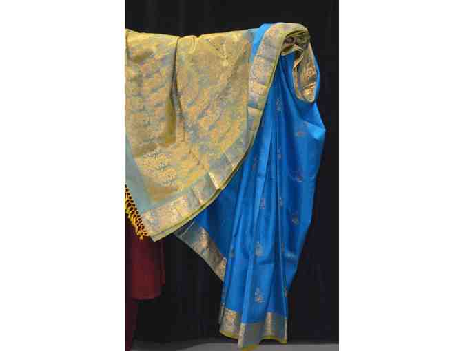 Blue on Blue With a tinge of green! A pure Kancheepuram saree in cobalt blue with blue/green border. Elaborate gold zari pallu! Embeded with gold thread work lotus motifs on the body. Attractive formal wear that will enhance your wardrobe. Pre-stitched blouse that can be made to fit. Additional blouse material added as an alternate blouse.