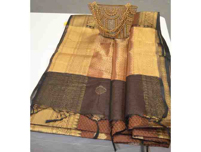 Festive Brown wth gold border silk cotton saree that is perfect for indoor and outdoor events - can be work all-day with comfort. Comes with a gorgeous sequined accessory bag!