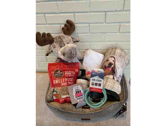 Gypsy Poodle Dog Basket includes Dog Bed, Shampoo, dog leash, wholesome treats, ChristMOOSE, pet blanket, Gypsy grooming koozie and adult Lg. long sleeve tshirt
