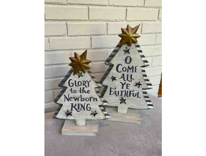 Pair of Wooden/Tin Christmas Trees. Height~ Smaller 14" Larger 18"