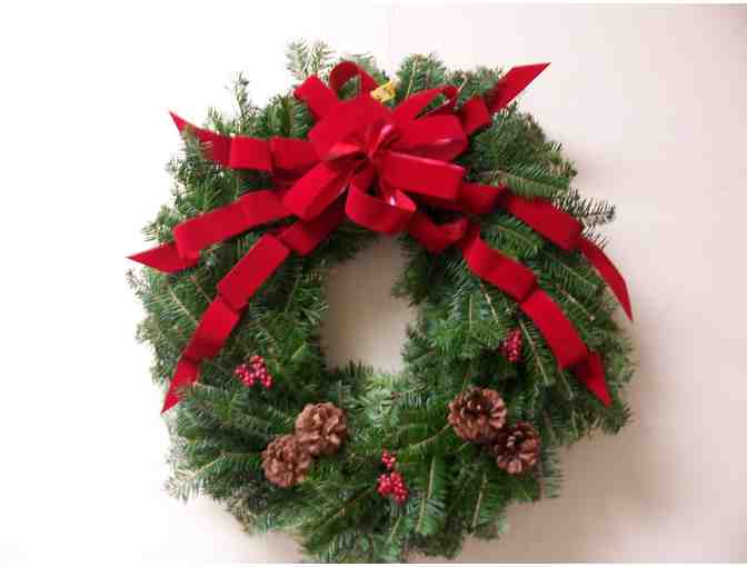 This is a beautiful 22" balsam wreath decorated with a bow and cones.