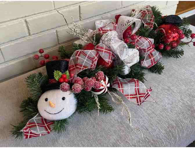 Christmas Centerpiece includes artifical greenery, a pair of jolly snowmen, shiny red ornaments and berries with White snowflake ribbon; measures 32 inches in length.