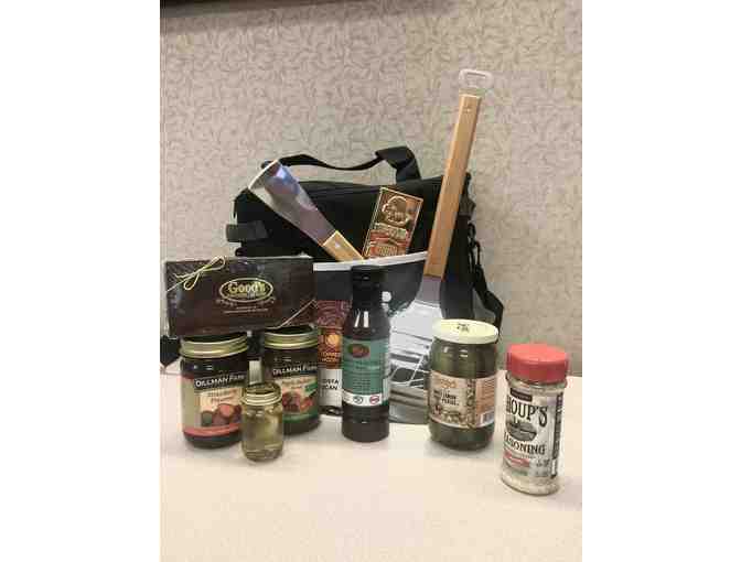 Spend a day the Hoosier way with this basket filled with yummy goodies from across the state of Indiana. Start your day with Dillman Farms strawberry preserves or apple butter spread on your favorite biscuits along with a cup of Copper Moon Costa Rican blend coffee. Your lunch sandwich will go perfect with Sechler's Sweet Lemon Strip pickles. Light up the grill for dinner and sprinkle Shoup's Seasoning on your preferred meat and use the FB logo grilling spatula before basting with Master's Hand BBQ sauce. Your bedtime snack will be perfect when you pull out your Indiana Farm Bureau blade to scoop up your favorite flavor of ice cream and pair it up with a chocolate treat from Good's Candy Shop or DeBrand's chocolate bar. Everything is packaged in a handy soft-sided cooler complete with a bottle opener, side pockets and an adjustable strap for easy carrying.