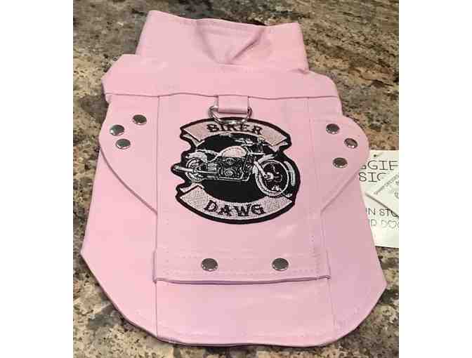 It's a Dog's life. Dress your little rebel in this adorable faux leather jacket. Expertly tailored, and lined jacket is made of Soft to-the-touch Vegan Leather with Studded accents including the embroidered bike logo patch.