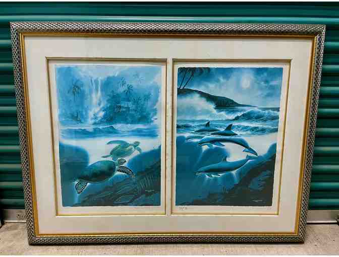 2 Wyland serigraphs each 16" x 30", "Turtle Water" and "Moonlight Dolphins", with certificate of authenticity, framed together at 43" x 33", will need new mats.