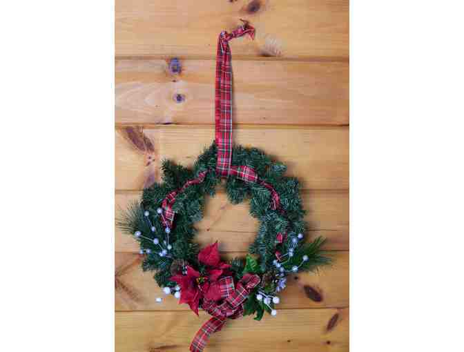 Decorate your door with this beautiful Holiday Wreath. This 18" Holiday Wreath is decorated with Red Poinsettia, pine cones, silver berries, and plaid ribbon. All greenery and accents are artifical, allowing the wreath to be used year after year.