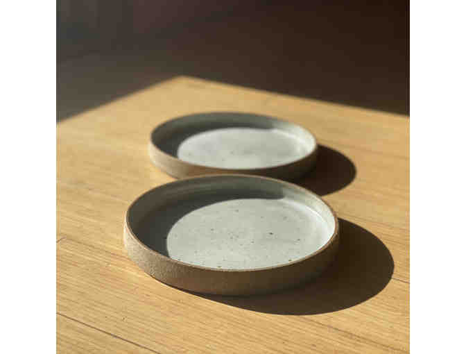 One 8'' serving tray in white satin glaze. The unglazed exterior has a wonderful beige color which is a beautiful contrast to the glazed surface. (~8"w x ~1-1/2"h)