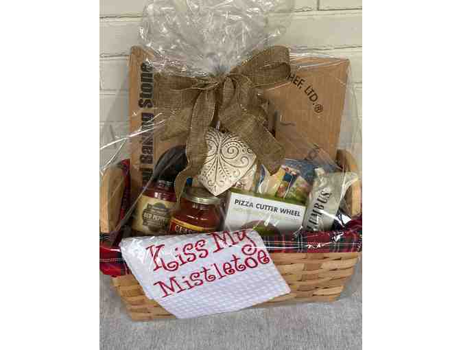 Lovely basket filled with everything pizza! Includes a Pampered Chef Pizza Stone; Pizza Cutter Wheel; Pizza Dough; Classico Pizza Sauce; Trader Joes Roasted Red Peppers; Pampered Chef Cookbook; "Kiss my Mistletoe" Towel; White-Washed Tin Heart Ornament and a Stick of Columbus Dry Pepperoni to make your pizza PERFECTO! YUM!