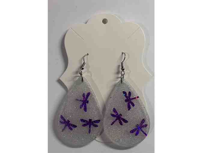 You are bidding on a pair of resin earrings. Purple dragonflies on foggy resin with silver glitter.