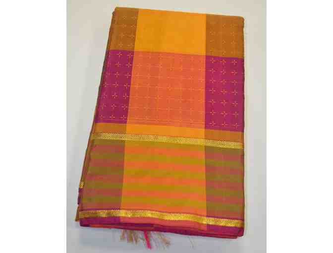 This pure silk sari with traditional design is back in vogue. The checks are multihued and the border is simple, so that it does not take away the richness from the body of the sari.