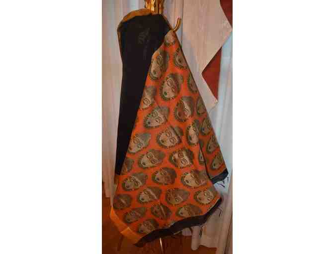 Striking yet serene, elegant yet exuberent this black beauty has a rich gold border. The pallu is a beautiful orange and adorned with Kalamkari printed budha figureheads evoking a sense of peace and prayer.