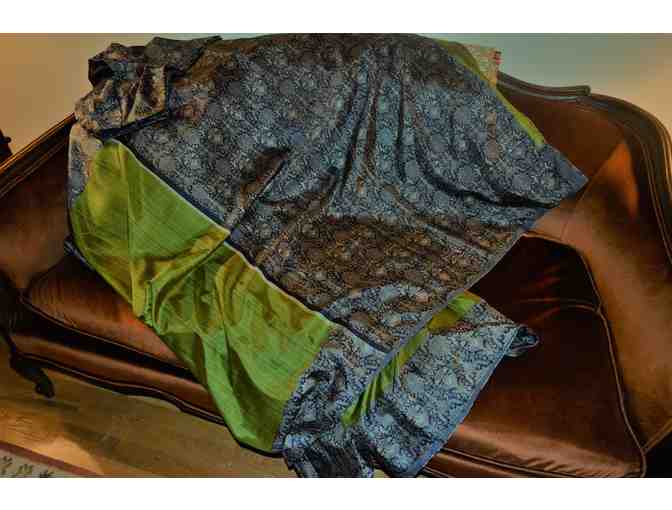 Banana silk in leaf green contrasted with navy blue. This saree is a great casual or evening wear. The pre-made blouse is high neck, trendy yet striking. A simple saree that will speak for itself!