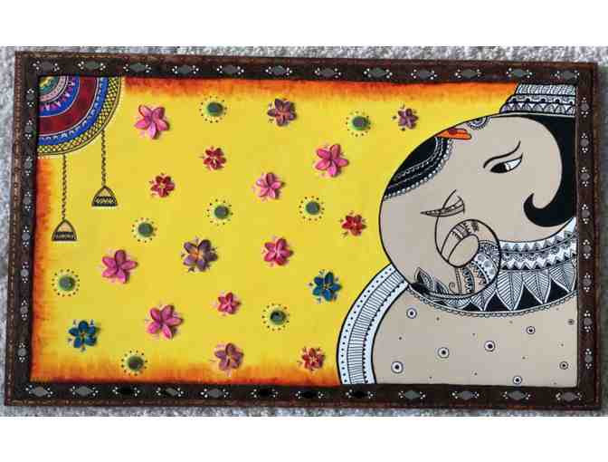 A rare combination of madhubani and lippan art work on wood. A painting right off the artist studio just for this occasion. Madhubani is a folk art representation from Bihar. The vibrant yellow and the lovely Ganesha will stand out on any wall! The size is 18x30 inches and can be readily hung at your home.