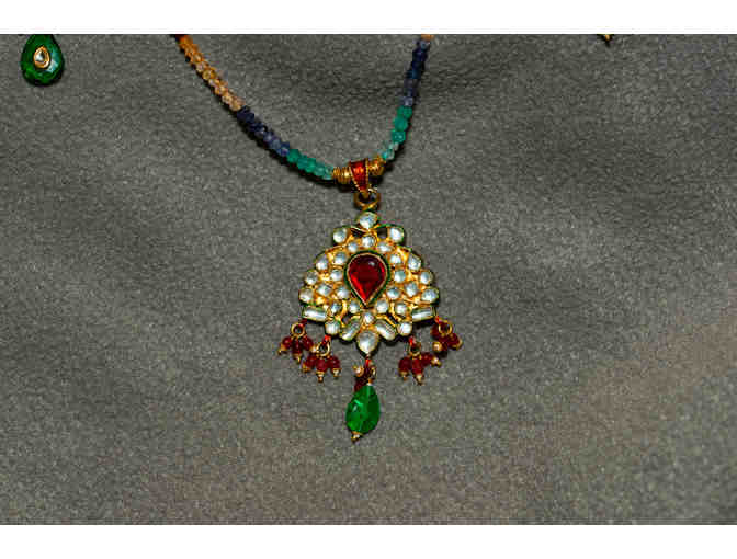 Sparkling navratan pendant with earrings with a ruby bead drop on the pendant and earrings makes this an eyecatching jewelry set for any special occasion