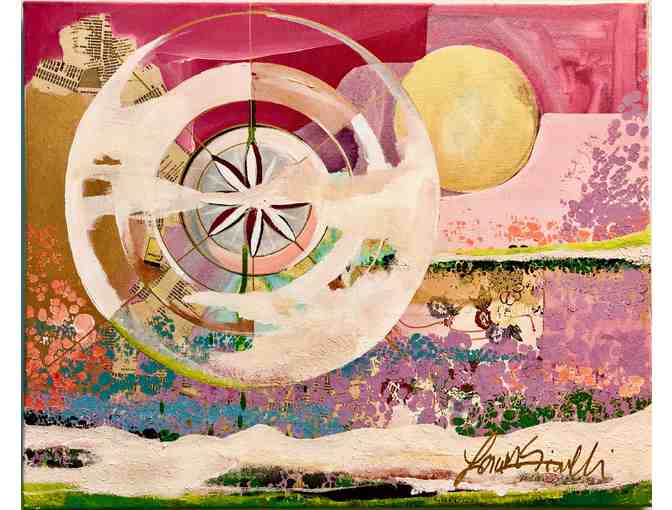 Original painting by Lora Finelli, titled "Golden Eclipse." Acrylic and collage on canvas, measures 16" x 20".