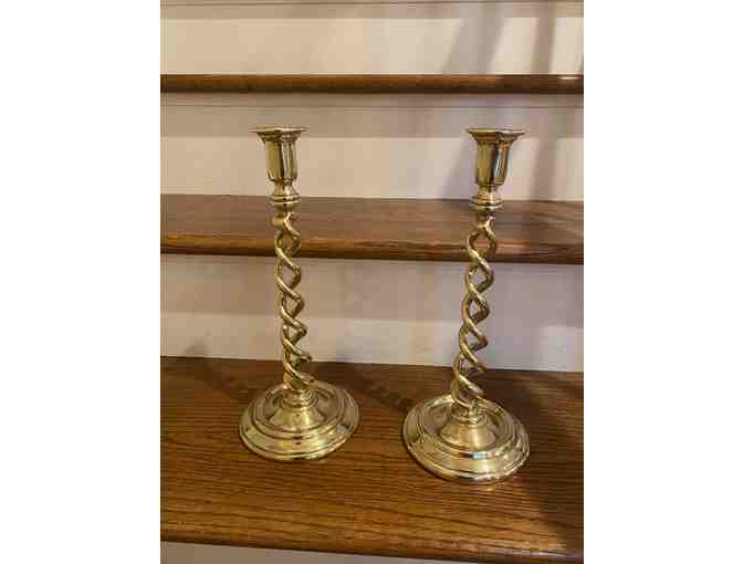 Pair of Brass Candlesticks; antique and unusual design. Donated by Jimmy Sellars Interior Decoration.