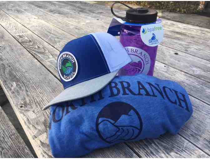 All you need to rep North Branch School for warmer weather or all year around! This package includes cotton blend long-sleeved t-shirt (so soft! and you choose desired size) 32oz Nalgene (in Prune purple) and NBS-logoed trucker hat.