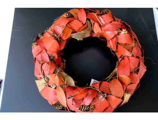 Wreath wrapped in red leaves with mini pine cones
