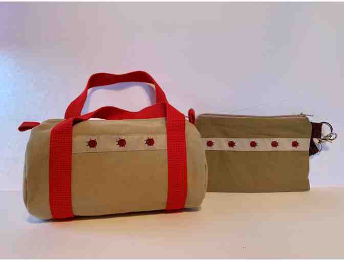 Bring out your nature side with these lady bug embroidered items. Made by Vicki Hagget, bringing 30 years of experience in the stitching industry these bags were hand designed and created in NH. This set is comprised of a tan ladybug wristlet measuring 8.25 by 5.5 as well as a lady bug embroidered mini duffle with red handles measuring 8.5 by 5 by 5.