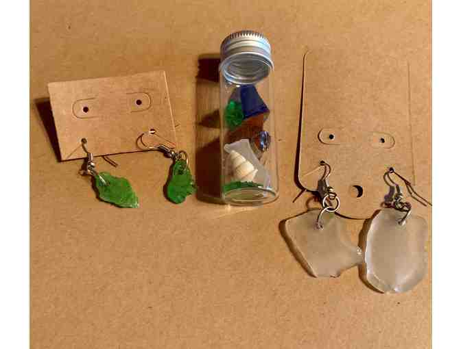 Take home these two pair of cute sea glass earrings collected from sea glass along the seacoast of Maine and New Hampshire. Donated by Sea glass Maine Art, these earrings will make the perfect gift for a family or friend this holiday season. Also included is a vile of assorted sea glass pieces.