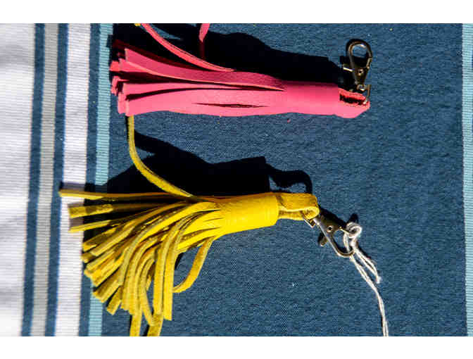 Bright, leather fringe that can be clipped to your key chain or bag to help find things more easily. About 4 inched long