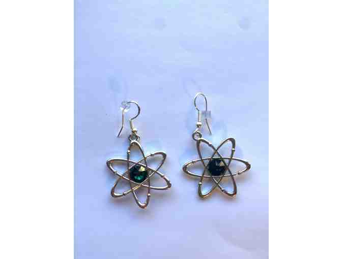 Back by popular demand... Show your school spirit! Be one of the first to own a handcrafted pair of Bronx Science Atom Earrings. This item was created by local artisans and made with an emerald Swarovski crystal "nucleus" and surrounded by a silver-plated base and backing.