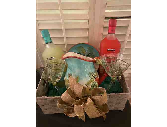 We all need some girlfriend time. And let's have some fun~ basket includes margarita wine cocktail, strawberry wine cocktail, palm tree 2 qt pitcher, 4 tapa plates, and 4 cocktail glasses.