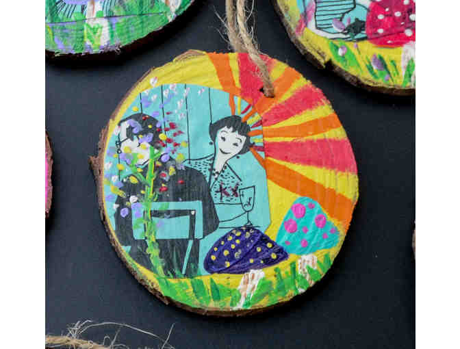Midcentury domestic images and painted mushrooms on wooden circles about 3" in diameter