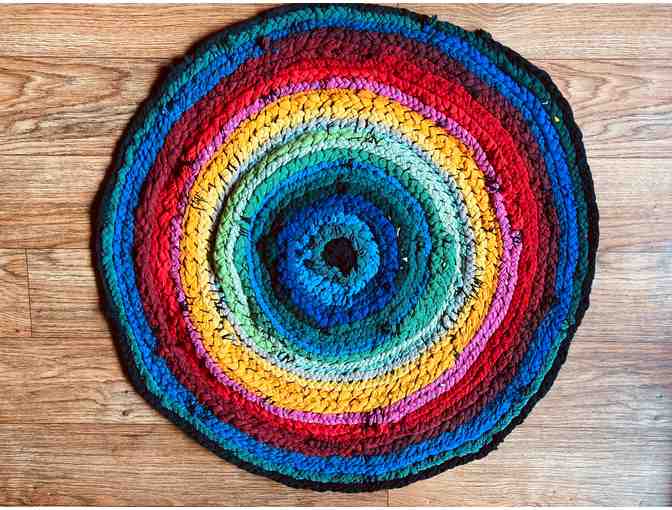 The Rio Vista 4th graders of Ms. Chamow and Ms. Morrill's classes braided torn up t-shirts to create a rug of rainbow colors.