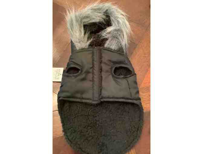 Your furbaby will be ready for walking in a winter wonderland with this cute hooded sherpa lined jacket.  This toasty warm jacket features a hood trimmed in faux fur and is sherpa lined.  The outer material on the jacket is water resistant so the snow will not melt keeping your pup warm and dry. The hood snaps back when your pup doesn't need it