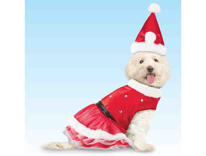 Your pup will love the attention she receives when dressed in this adorable Mrs. Claus outfit. Set includes a dress with buckle-like detailing, acrylic "crystal" beads, faux fur trim, a cute tulle skirt and a Santa hat with pom pom detail. Touch closure straps on the dress fits under stomach and around neck for a custom fit. The Santa has tie straps for under the chin.