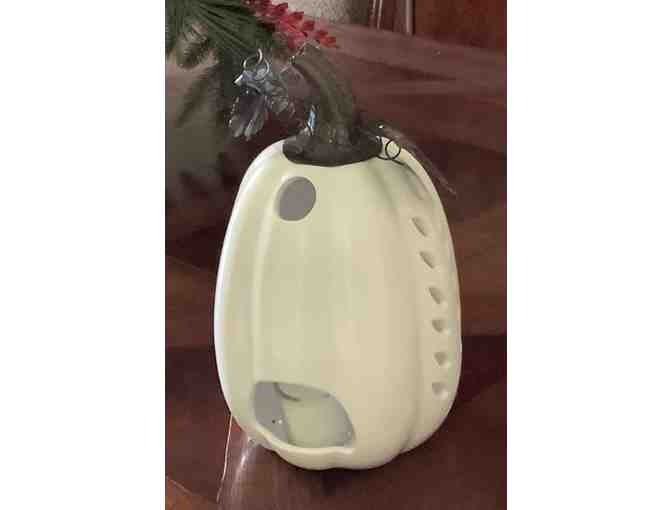 Your house will be beautifully lit with this gorgeous ceramic white pumpkin with bronze stem and leaves. Stands at 11" high. You can add a votive candle or small light to create a warm glow.