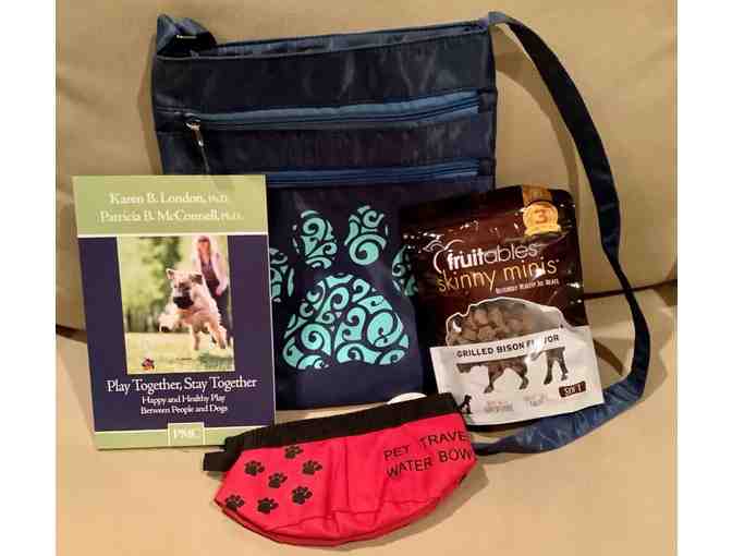 Great for walks or nights out - this cross body pawprint back is roomy. You can carry the included treats and water bowl as well as your wallet, masks phone and books. The bag has multiple pockets to store your items in. For extra fun, we've added a copy of "Play together, Stay together" a training book for play between dogs and their families.