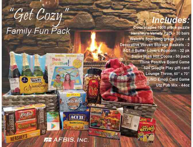 "Get Cozy" Family Fun Pack Includes: Colorscapes 1000 piece puzzle Hershey's Variety Pack - 30 bars Welch's Sparkling grape juice - 4 Decorative Woven Storage Baskets - 2 ACT II Butter Lovers Popcorn - 32 pack Swiss Miss Hot Cocoa - 50 pack Think Positive Board Game $25 Google Play gift card Lounge Throw, 60" x 70" UNO Emoji Card Game Utz Pub Mix - 44oz