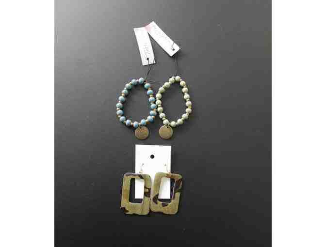Green bead stretch bracelet with "Karma" charm. Blue bead stretch bracelet with "Live Your Dream" charm. + Earrings: Green/Black cowhide square loops 2.25" long X 1.75" wide
