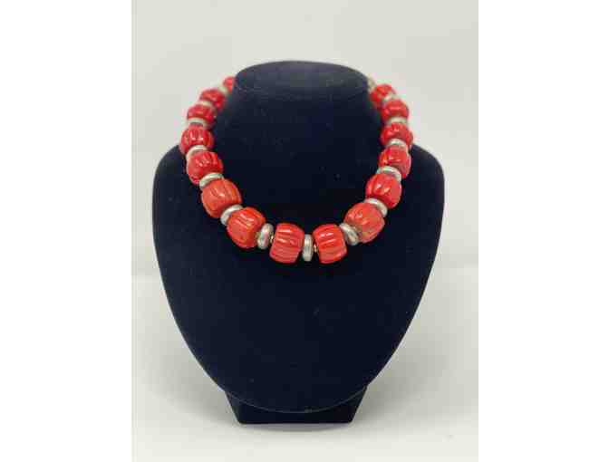 Pumpkin shaped beads of tinted coral with pewter beads.