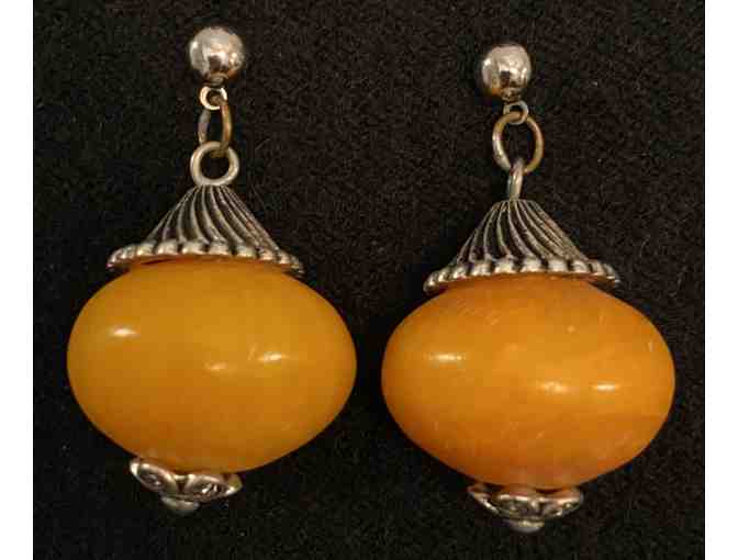 Yellow Vintage African amber rondelle ornaments, also known as Moroccan Amber, resin from the African trade bead- mounted with scored solver, pewter cones and floral caps- India. Plated furnishings and surgical steel posts. USA