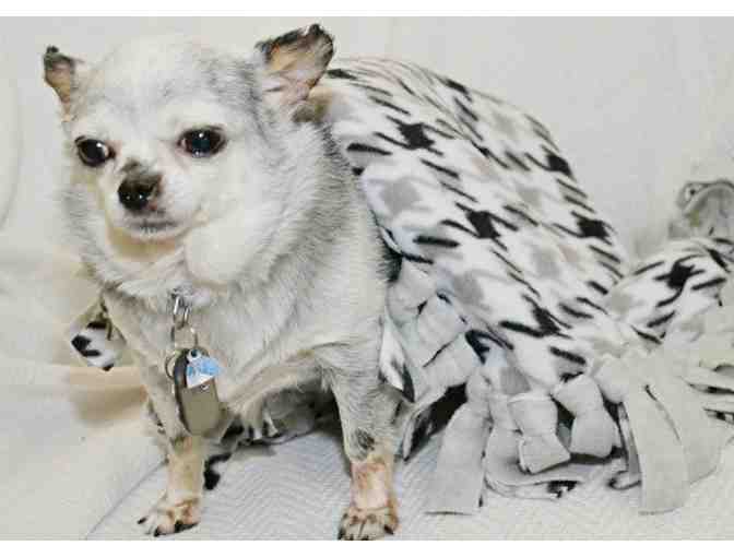 From Teddy's Personal Collection - 19" x 19" lovingly-used double-layer black/grey/patterned tied fleece blanket. Winner will also receive a 5x7" photo print of Teddy with this item.