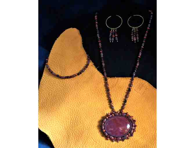 What a beautiful set! A large, beautiful Jasper stone was cut, polished and accented with accenting bead embroidery by local artist Sabrina Bailey.