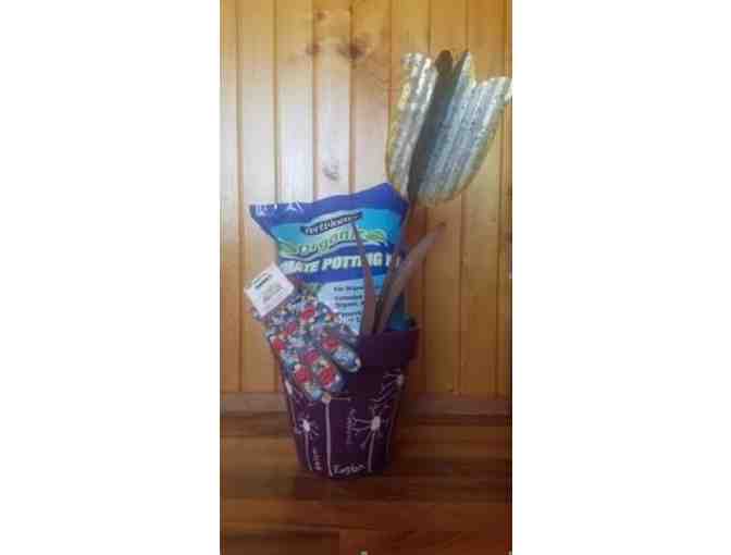 Painted flower pot decorated with Ms. Adler's 1st grade "flowers." Complete with a bag of potting soil, garden gloves and a garden spike.