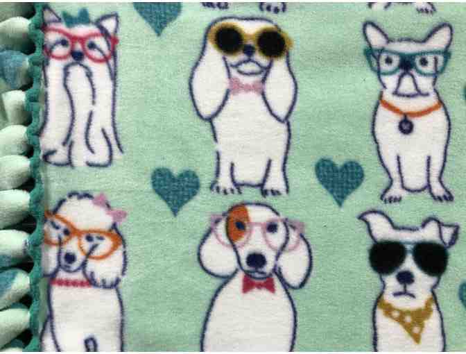 Whimsical turquoise 'Dogs in Glasses' anti-pill, plush fleece dog blanket with a solid turquoise back is tied, but not knotted.