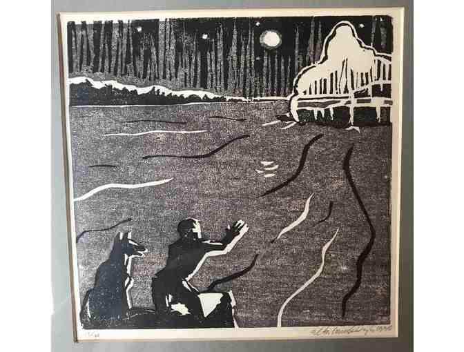 An 8.5" x 11 " woodcut print "Dog and Waterfall" by Toronto artist Alta Louise Doyle.